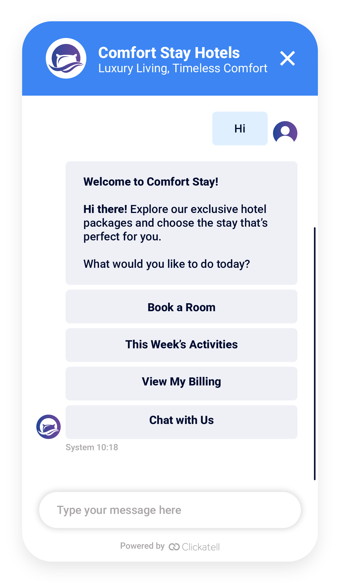 Web Chat widget embedded on your website, where visitors can instantly choose from options like exploring services, checking account details, managing bookings or purchases, or connecting directly with a live agent.